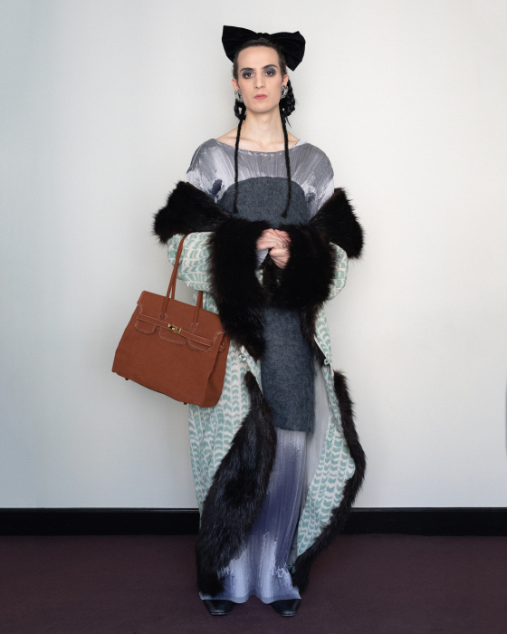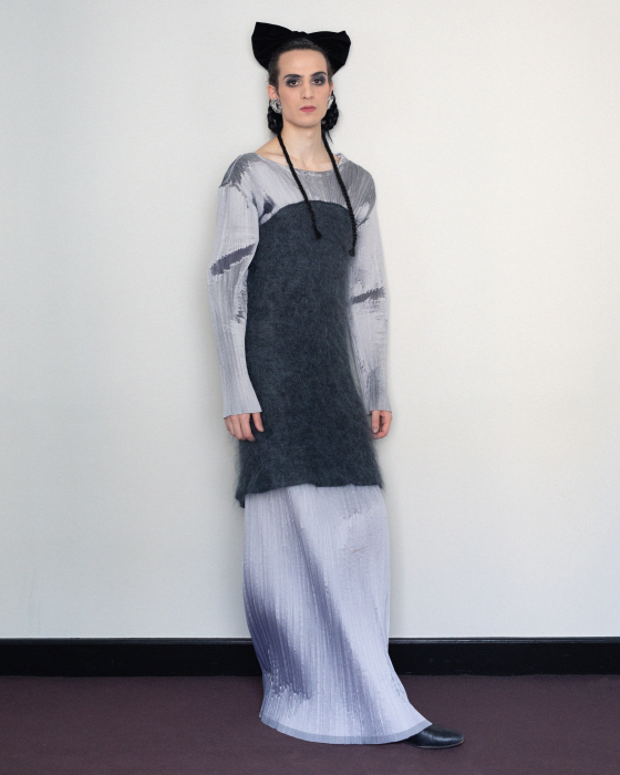 Durch Mittel wie einem einheitlichen Farbkonzept aus Schwarz-,Weiß-, Grau-, und Haut-Tönen, sowie einer Überzeichnung der bekannten Formen und der zugrundeliegenden Materialien, stellt das Kostümbild eine stilisierte Form dieser Mode her. Glanz, Glätte und sichtbar synthetische Materialien, sind Mittel derer wir uns bedienen, um diese Stilisierung herzustellen.